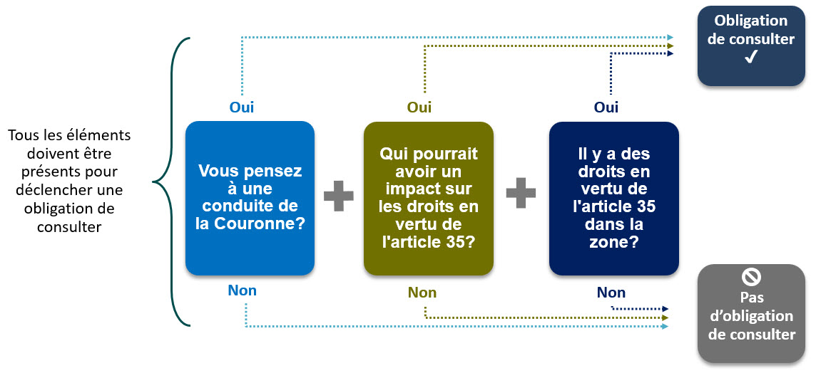 Cet organigramme illustre le processus décisionnel permettant de déterminer si la Couronne a l’obligation de consulter les peuples autochtones. Il commence par l’énoncé : « Tous les éléments doivent être présents pour déclencher une obligation de consulter », puis enchaîne 3 questions clés : d’abord, « Vous pensez à une conduite de la Couronne? » (Case bleue), suivie de « Qui pourrait avoir un impact sur les droits en vertu de l’article 35? » (Case verte), et « Il y a des droits en vertu de l’article 35 dans la zone? » (Case bleu foncé). Si la réponse à chacune de ces questions est « Oui », une flèche mène à une case vert foncé indiquant « Obligation de consulter ». Par contre, si l’une des réponses est « Non », une flèche conduit à une case grise marquée « Pas d’obligation de consulter ». L’organigramme souligne ainsi que l’obligation de consulter ne s’applique que si les 3 conditions sont satisfaites.