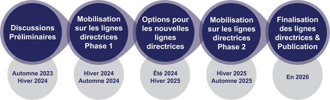 Cinq (5) cercles bleus décrivent les étapes du processus de renouvellement des lignes directrices. Cinq (5) cercles gris quant à eux correspondent aux étapes indiquant la période où chaque étape aura lieu. Le premier cercle bleu indique des discussions préliminaires et sur son cercle jaune se lit automne 2023-hiver 2024. Le deuxième cercle bleu indique la phase 1 de la mobilisation sur les lignes directrices et sur le cercle gris se lit de l’hiver 2024 à l’automne 2024. Le troisième cercle bleu indique la phase d’élaboration d’options pour les nouvelles lignes directrices et sur le cercle gris se lit été 2024-hiver 2025. Le quatrième cercle bleu indique la phase 2 de la mobilisation sur les lignes directrices et sur son cercle gris se lit de l’hiver 2025 à l’automne 2025. Le cinquième cercle bleu indique la finalisation et la publication des lignes directrices et sur le cercle gris se lit en 2026.