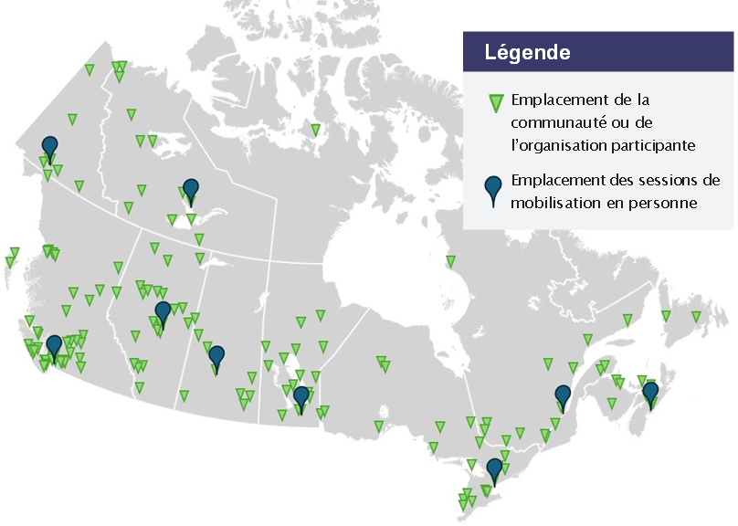 La carte suivante indique l’emplacement des sessions de mobilisation en personne et l’emplacement des communautés et organisations participantes de la phase 1, y compris les sessions en personne et virtuelles.