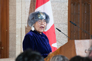 Image 10: In this photo, former Indian Residential School Student and Selection Committee member, Madeleine Dion Stout, addresses guests at the Dedication Ceremony for the Stained Glass Window.