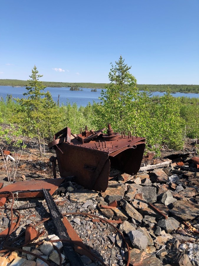 Text alternative for A rusted cart and debris on the main Thompson-Lundmark Mine site